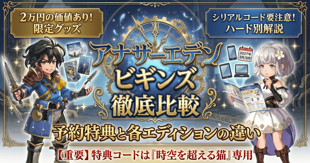アナザーエデンビギンズの予約が開始されたがハードによって展開が異なりNintendoSwitch2版の通常版5480円から20480円のスペシャルコレクションボックスまで価格帯が大きく分かれている。まずは事実として各エディションの公式仕様を整理しよう。