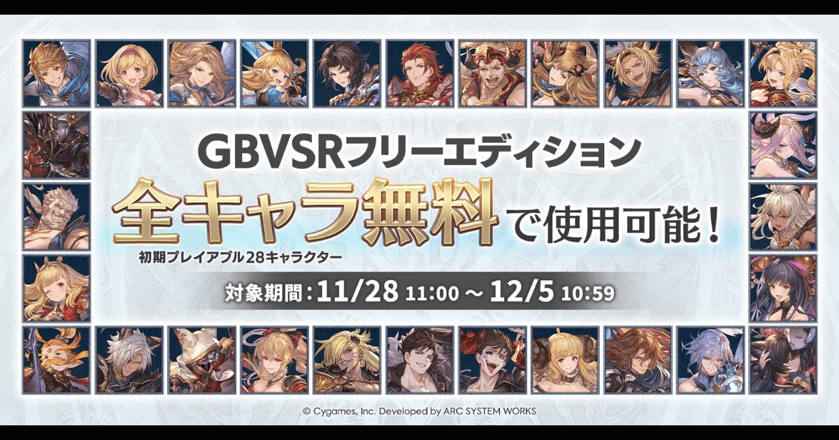 大人気格闘ゲーム『グランブルーファンタジーヴァーサス -ライジング-』(GBVSR)の無料版「フリーエディション」で、通常は制限されている初期実装の28キャラクターが全て使用可能になるキャンペーンが実施されます。