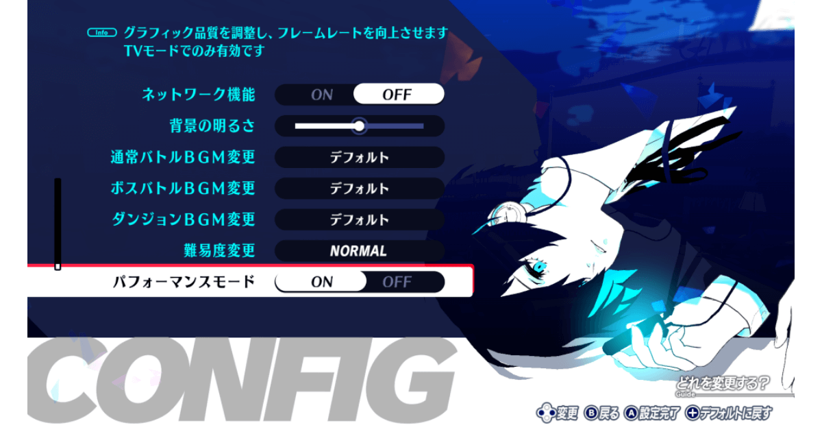 Switch2版P3Rのパフォーマンスモードは、TVモード時にグラフィックを最適化し最大60FPSの滑らかな描画を実現します。コンフィグからオンオフが可能で、従来の画質優先設定と比べてアクションの追従性が劇的に向上するのが最大の違いです。