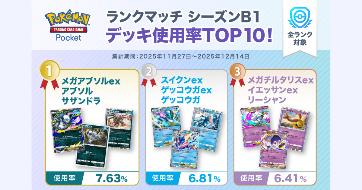 この変化により、B1で上位だったスイクンex軸などの低〜中打点デッキは、HP220の壁を突破できずに苦戦を強いられるでしょう。1月からのB1aランクマッチでは、この「高HP高火力」をいかに早く準備し、いかに早く倒すかが勝負の分かれ目となります。