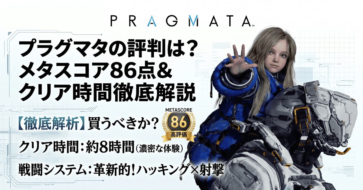 結論:プラグマタのメタスコアは86点(2026年4月時点)です。海外レビューでは、ハッキングと射撃を融合させた革新的な戦闘システムや、主人公ヒューとディアナの魅力的な関係性が高く評価されています。一方で、後半の展開の粗さや、クリア時間が約8時間と短めである点を指摘する声もあります。