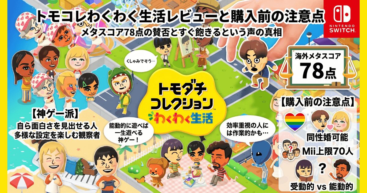 ゲマプラ編集長のしんです。10年以上待ちわびたトモコレ完全新作がついにNintendoSwitchで出たな。海外メタスコアは78点と微妙な数字だけど大手メディアの表面的な仕様まとめではこのゲームの本質は絶対にわからない。今回は良い部分も悪い部分も包み隠さず本音で語っていくぞ。